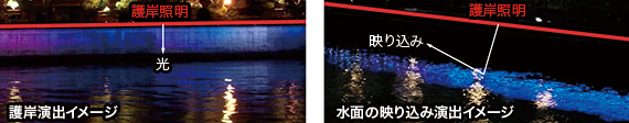 視点場である橋上及び対岸からの景観に配慮し,遮光フードにより視点場から器具の輝度を隠し,照らしている護岸,水面のみを見せることで,少ない光量で十分に視認できる演出となっている。また,設置側護岸上部への漏れ光も無くしているため,落ち着いた空間が維持されている。