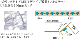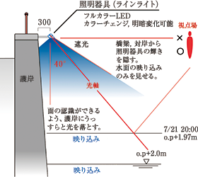 照明器具は施工性,保守性を考慮して1950mmを1器具として2000mm間隔で配置し,護岸160mに対しラインで照明している。1器具内には,明るさ,ラインとしての見え方を考慮し,1WフルカラーLEDを100mm間隔で配置している。フルカラーLEDを使用し,細かな制御が可能なため,施工後に全体景観に合わせ,明るさ,色,動きを調整し,華美ではなく,自然な景観を創り出している。