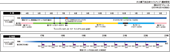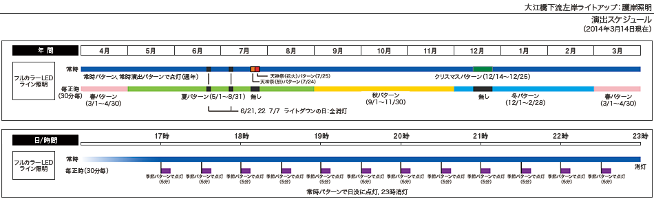 2014年3月に演出が修正され,中之島ガーデンブリッジ及び阪神高速道路桁下照明と演出を合わせ,大江橋下流で一体感,統一感のある演出となった。