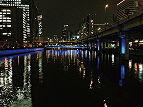 堂島川護岸の3施設と同様に,常時の演出を「水」をイメージした演出とし,「青色」を基調とした光のグラデーションを上流から下流にかけて徐々に光を変化させ,流れているイメージを創り出している。また,季節を表現した演出パターンを毎正時(30分毎)に出現させ,時間の共有を図っている。クリスマス時期にはイベントパターンを表示し,より地域に属した演出となっている。