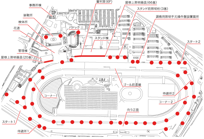馬場照明として,ゴール前直線は水平面で維持平均照度が750ℓx以上,向正面440ℓx以上,コーナーは440ℓx以上を確保している。また,ゴール前直線は,地盤面から1.5mの高さの鉛直面(スタンドから馬場を見た方面)で維持照度1000ℓx以上,向正面は860ℓx以上を確保している。