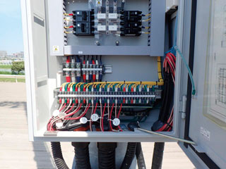 本施設の点灯パターンは,レース用照明と調教用照明があり,調教用照明は,レース用照明の一部を点灯させて使用している。このため,分電盤内に端子台を設け,灯具ごとの配線を端子接続し,調教用照明の点灯箇所を,調教のやり方に合わせて変更できるよう利便性を図っている(図7)。