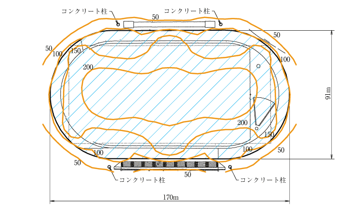 本施設は,メイングラウンドはJIS照度基準の陸上競技のレクリエーションレベル(照度100ℓx以上),サブグラウンドはサッカーのレクリエーションレベル(照度100ℓx以上)を確保しつつ,共に既設のメタルハライドランプ1kWでの照度と同等の照度値になるように設定した。図3,図4にメイングラウンド,サブグラウンドの照度分布図を示す。