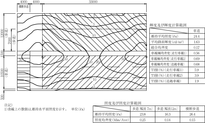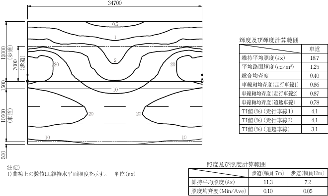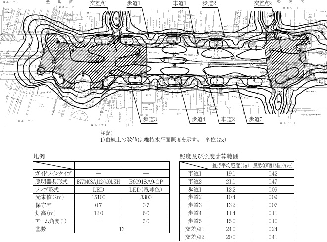 照度は,車道15ℓx,歩道10ℓx,交差点20ℓxを目安に設計を行った(図1参照)。