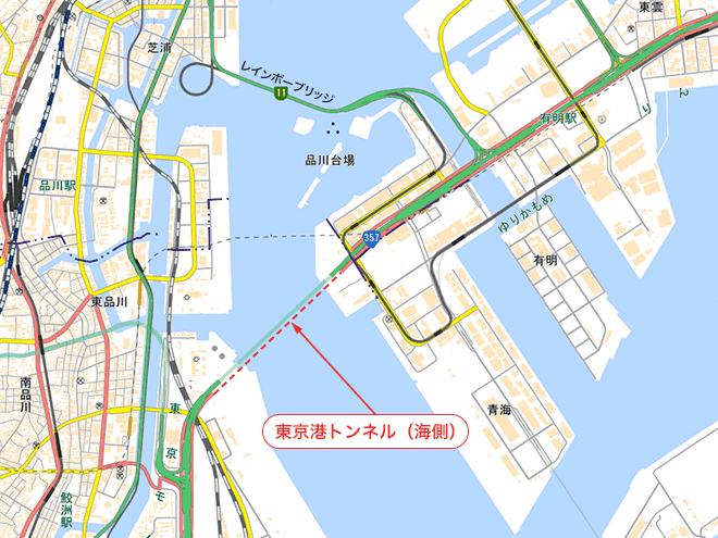 国道357号(東京湾岸道路)は,横須賀市から横浜市,川崎市,東京都を通り,千葉市中央区に至る延長約80kmで海岸沿いの主として埋立地を利用した道路である。東京港トンネル(国道357号)は,慢性的な渋滞が発生している東京港トンネル(高速湾岸線)と並行して,一般部である国道357号を整備することで,海側(西行き)の渋滞緩和を図る事業である。これにより都心部から臨海部へ交通が転換し,都心部の交通混雑が緩和するほか,空港や湾岸地域の物流拠点とのアクセス性を向上させ,物流の効率化を図っている。