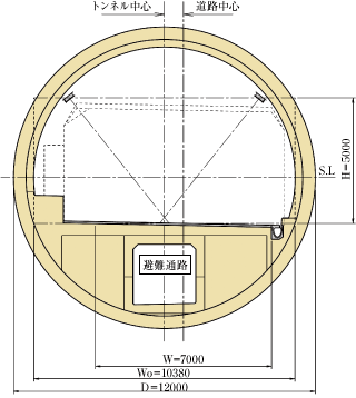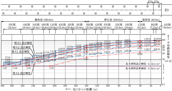 以上の条件に基づき設計を行った結果を図2,図3に示す。図2はトンネルの断面を,図3は入口照明曲線図を示している。