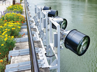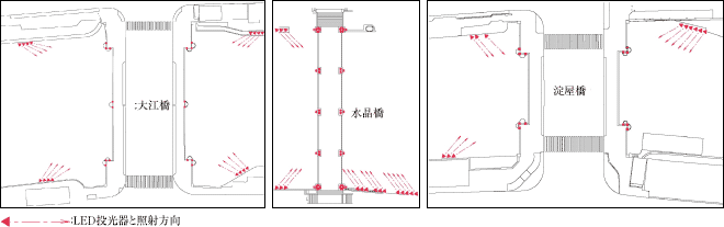 LEDioc FLOOD SPOLARTは大江橋に16台,淀屋橋に12台,水晶橋に17台設置した。また,親柱灯には電球色タイプのLEDioc LEDライトバルブG™(12Wタイプ)でLED化した。投光器の配置図および設置状況を示す(図9,図10)。