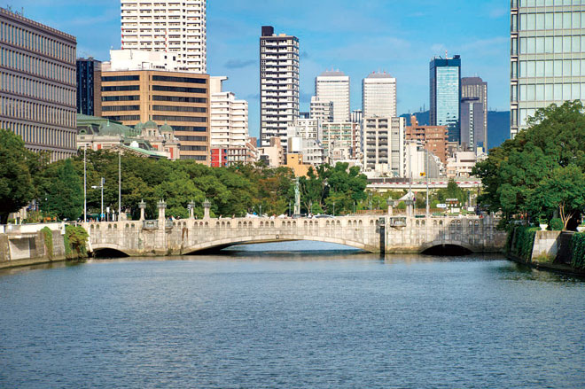 LEDioc FLOOD SPOLARTの電球色タイプは平均演色評価数Raが80と高いため,夜間でも橋梁側面の素材の色味を自然に再現できている。淀屋橋の昼景と夜景の比較を例に示す(図11,図12)。
