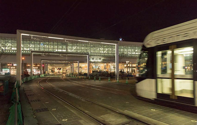 富山市は,従来から路面電車が運行し,市民の重要な移動手段として親しまれている。2015年3月に開業した北陸新幹線を契機とした富山駅周辺整備事業の一つとして,富山駅が新しく生まれ変わり,北陸新幹線の高架下に路面電車の停留場「富山駅」が新設された。富山市は駅南北の路面電車路線を接続する南北接続事業を進めていて,今回新幹線高架下から南口駅前広場まで,第1期区間として路面電車の軌道を約160m延伸して乗り入れを開始した。この停留場は,新幹線・在来線改札口やバス・タクシー乗り場に近接し,乗り換えの利便性がとても高い交通拠点となっている。