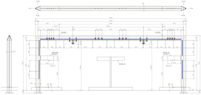 門型架線柱内部にLEDラインユニットを取り付け,門柱内側をラインで光るよう配置している。照明器具の光源部は直接見せず,架線柱内部の反射板による間接光により軌道空間内の安全な明るさを確保している。また,架線柱内部の限られた空間に設置できるような器具形状,構造,配光の照明器具を設計している(図1,図2)。