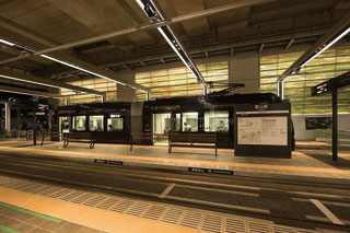 路面電車に必要な架線柱や信号等を景観形成に必要な要素と捉え,門型の架線柱として多目的な用途に活用できるようデザインされている。連続する門型架線柱は,駅舎の内部にも設置され,南北の軸性を強調するとともに路面電車空間を象徴的に示している。夜間には光る門型架線柱として計画され,シンボリックな景観を創出している(図1)。