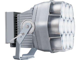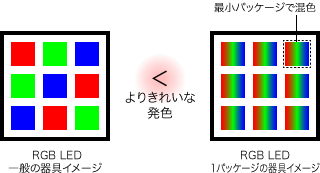 投光器はLEDioc FLOOD BLITZ フルカラー(200Wタイプ・狭角配光)を採用している(図5)。フルカラーLEDは,光の三原色RGB(赤・緑・青)の各色を256階調することで1670万色を表現可能(理論値)となり,多彩なカラー表現が可能である。RGBのフルカラーLEDは,最小パッケージによってカラーが混ざり合うことで,器具から出力された光がむらなくきれいに発光できる(図6)。