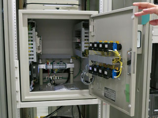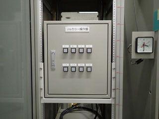 本施設は,毎日の天気予報を指定色でライトアップするため,DMXコントローラが収納されたフルカラー操作盤(図8,図9)の前面扉に外部信号入力用のボタンスイッチを配置し,8パターンのプログラムを手動で再生する設備とした。実際の運用方法は,当日に天気予報のプログラムが入力されているボタンスイッチを選択し点灯することで,翌日の天気予報を発信している。