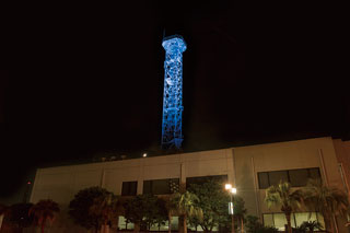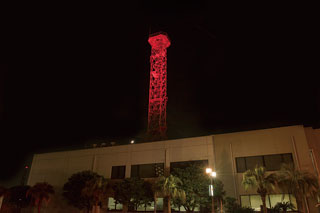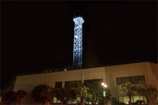 電波塔の高さは約40mで,塔の基礎に近い位置での器具設置であったため,「高出力」で「シャープな配光」の投光器が必要であった。また,トラス構造の4面体であるため鋼材の背面に陰ができないように,投光器は正面配置ではなく四隅に配置した。電波塔の上部に光のピークを持っていき,下部を暗くして中段から上部をライトアップすることで,電波塔を浮かび上がらせる手法とした。