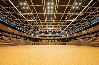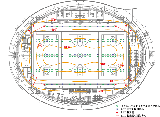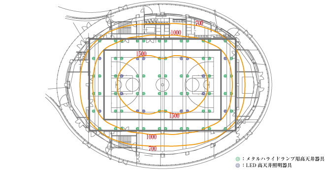 本施設は,各種スポーツ競技やコンサート,イベント,また大規模コンベンションの開催が可能な多目的施設である。照度においては,一般利用から国際大会クラスのJIS照度基準を満足し,多様な用途に対応できる照度設定となっている。また光源は,セラミックメタルハライドランプ660Wと,瞬時点灯が可能な高出力型180WのLED照明器具を採用し,高効率で省エネルギーの照明設備となっている。