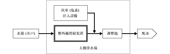 大橋浄水場の浄水処理方法は,次亜塩素滅菌処理と併用して紫外線照射処理を行っている。大橋浄水場の施設の諸元を表1に示す。
