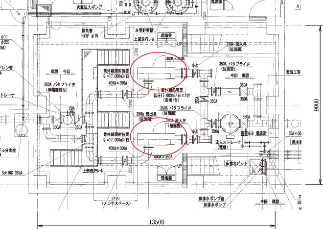 図4の上側から流入した処理水は,装置を通過するわずかな間に紫外線が照射される。その後,次亜(次亜塩素酸ナトリウム)が注入され,調整池に送られた後,配水される。