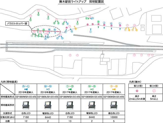 - バラストホッパー(石垣)部は,桜のライトアップに使用する機種と違う色温度にして照明を行う。