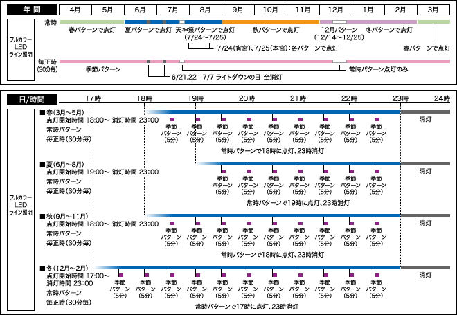 演出は春パターン(3月~5月),夏パターン(6月~8月),秋パターン(9月~11月),冬パターン(12月~2月)を常時パターンとして点灯し,毎正時(30分毎)に春夏秋冬4つのパターン要素を入れ込んだ季節パターンを5分間点灯させている。夏に行われる天神祭や,クリスマスの時期にはイベントパターンを点灯させ,より地域に属した演出となっている(図11~19)。