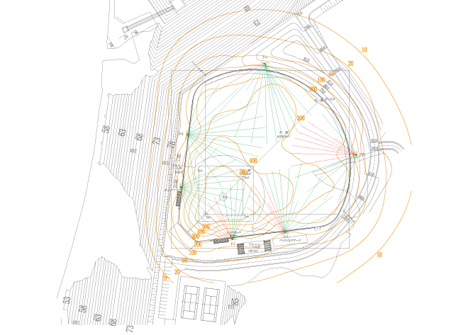 野球場の照度分布図を図2に,園路の照度分布図を図3に示す。なお,園路の照度分布図は南ゲート付近の一部区間のみ掲載している。