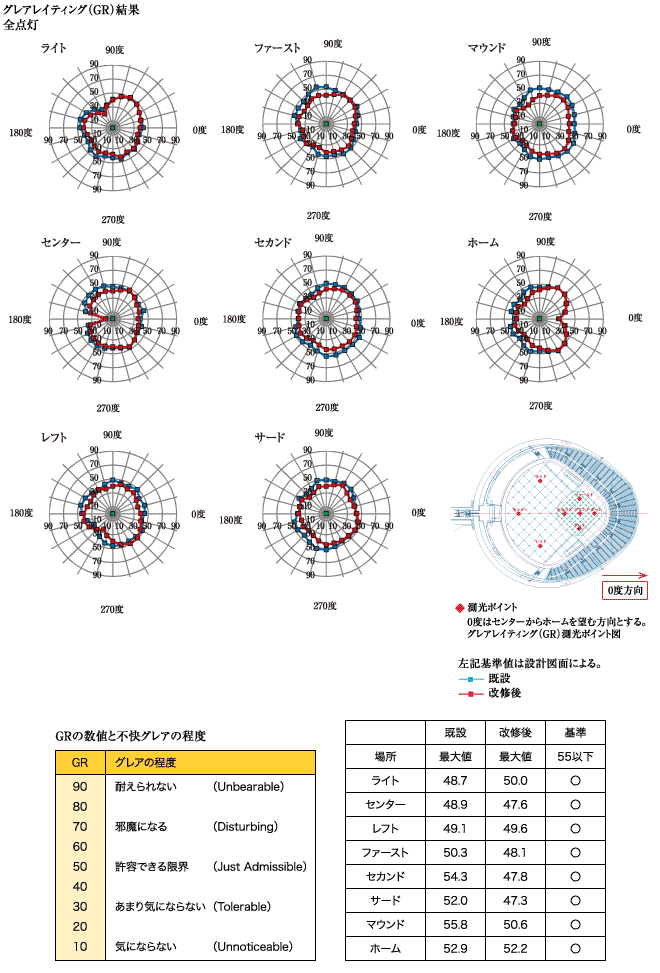 本施設において,LED投光器のLEDioc FLOOD ZESTとLEDioc FLOOD DUELLを設置する場所に応じて使い分けし,プロ野球開催に必要な照度と均斉度を満足することができ,良好なナイター照明環境を作ることができた。現地で主アーチに設置してあるLED投光器の角度調整を行いながら,グレア低減する方法としてクロスエイミングが必要であるとあらためて感じ,既設設備の限られたスペースでクロスエイミングを行う難しさを実感した。今回,改修前と改修後の光環境測定を施工業者様,関係部署の方々のご協力のもとに行うことができたことを,あらためて御礼申し上げる。