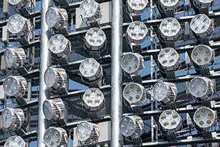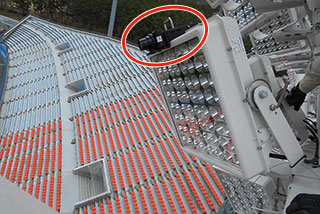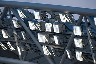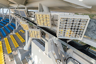 特に注意した点として,HID投光器と同じような扇形のエイミングをすると,グラウンドから見た際にLED投光器が光の塊となって見えてしまうため,グレアを低減する目的でクロスエイミングを行っている。図8,図9に主アーチ部,水平アーチ部のLEDioc FLOOD ZESTの取付状況写真を,図10に照明鉄塔のLEDioc FLOOD DUELLの取付状況写真を示す。