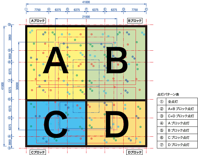 本施設は,全点灯時で維持平均照度1000ℓxを満足するように設計を行った。メインコートを4つのブロックに分け,7パターンのエリア点灯が可能となっており,それぞれのパターンで4段階(100%,75%,50%,25%)の間引き点灯ができる。国際大会からレクリエーションレベルまで幅広い利用目的に対応できるため,プレイ環境に適した明るさに設定することが可能である(図3)。