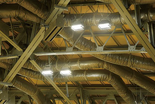 本施設は,球技種目が主な利用目的のため,見上げた際のまぶしさを軽減することに留意したLED高天井用照明器具を導入した。