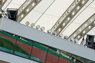 現行品の中で,最も光束が高い投光器LEDioc FLOOD DUELL 1400を使用することで,既存設備よりも明るさを向上させた。水平面だけでなく鉛直面および空間照度も考慮した設計としている。また,メインカメラの映りを向上させる目的で,メインスタンド屋上部にLED器具を新規で設置した(図3)。