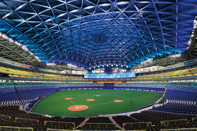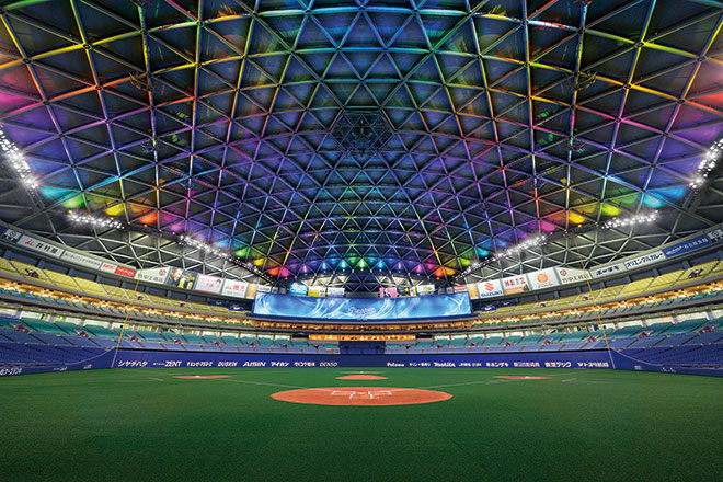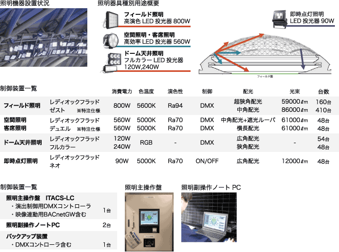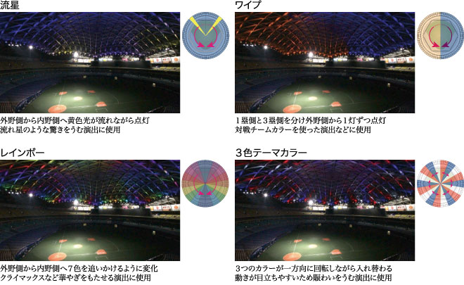 フィールド照明による演出は,大光量を瞬時に細かく制御するため空間の見え方をダイナミックに変化させる。一方,ドーム天井演出照明は,カラー光の持つ心理的な影響や,チームカラーを使用することによる一体感の創出など感情に訴える演出が可能となる。