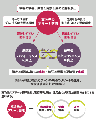 競技者がプレーに集中できる良好な照明環境,観戦者が臨場感のあるプレーを楽しめる照明環境,さらに試合の興奮をより感動的な体験へとつなげる照明演出を実現する高次元のアリーナ照明設備を導入することで,驚きと感動をもたらす体験・体感型の照明空間の実現を目指した。図3にコンセプトダイアグラムを示す。