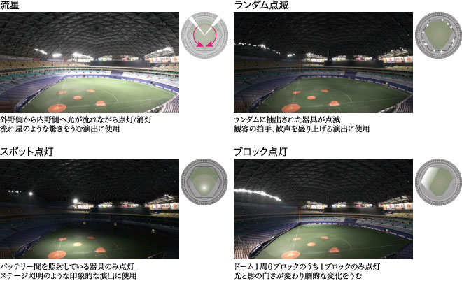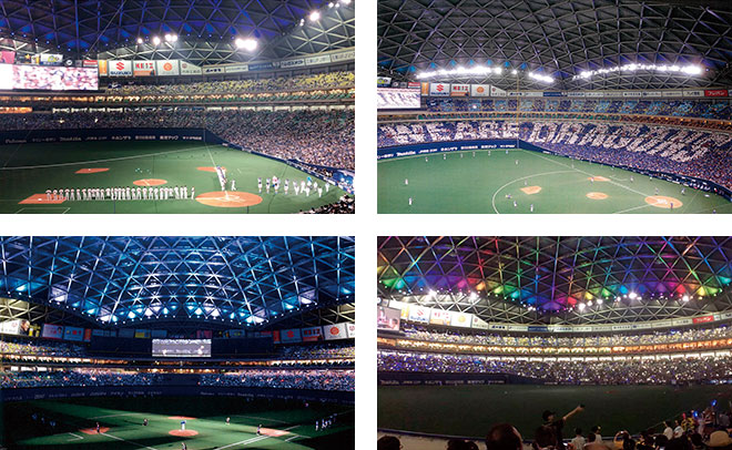 プロ野球試合における照明演出は,プレーヤーへの影響を最優先とし,球団およびドーム施設の担当部署による監修のもと運用を行っている。改修後2シーズンが経過した現時点では,試合開始から終了まではフィールド照明の明るさを維持したまま,ホームランやイニング間などのプレーが中断するタイミングでドーム天井のカラー照明を変化させて演出を行っている。試合勝利後には,会場を暗転させてフィールド照明とドーム天井照明,そして音楽を組合せ,光の演出をメインに用いたショーを行っており,勝利を華やかに演出するとともに,会場が1つになって勝利の喜びを分かち合う,体験・体感型のイベントとなっている。