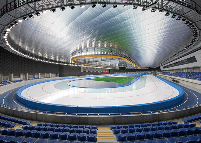 八戸市屋内スケート場建設事業新築工事(YSアリーナ八戸) - 国際競技対応スピードスケートリンク納入施設例 -