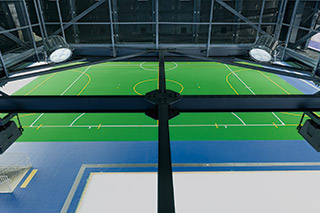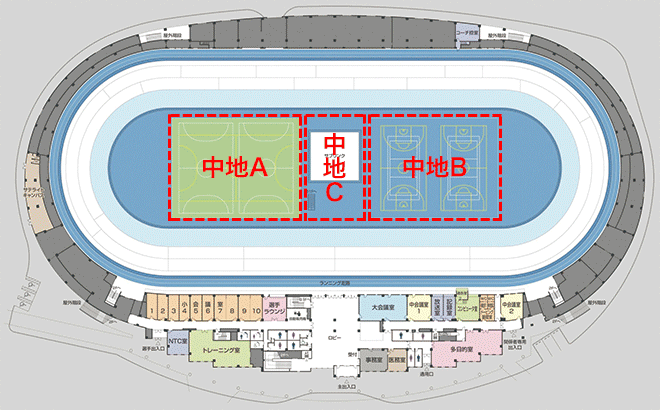 約14000m²のアリーナは,国際規格16m幅の400mダブルトラックスケートリンクを中心に,リンク内側にはフットサル用人工芝を敷いた約33m×42m競技面と,バスケットやバレーなどに活用できる約33m×42mの体育館長尺床,さらに約16m×16mミニリンク一面を有し,リンク外周には幅1.55m×2レーンのランニングコースが併設される。