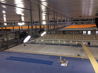 中地照明については,前項記載の通り,球技を想定した中地A・B部と,練習用ミニリンクを有する中地C部が存在し,中地A・Bの取付方法はバトン方式とされ,投光器を吊り下げた状態から照射する方法で照度要件を満たす検討を行うものとし,検証後,図5の施工を行った。
