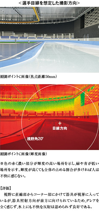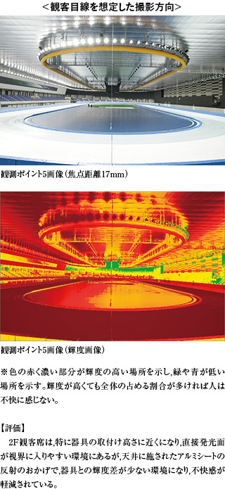 この要因は,氷の状態保持のため,アリーナ内部を一定温度に保つために天井に張られたアルミシートの影響が大きく,図17のQUAPIXによる光環境の評価でその効果を確認することができた。