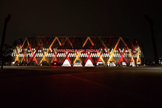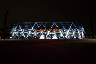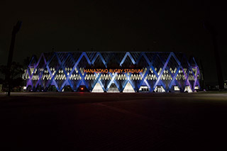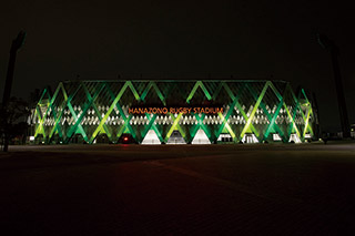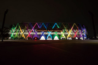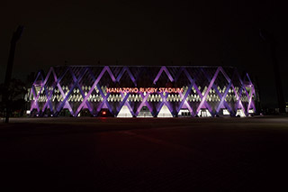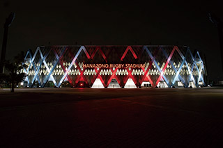 本施設は,ラグビーワールドカップ2019の開催に合わせて,+αの付加価値で大会をより盛り上げるために行ったライトアップであり,演出効果を最大限に発揮するためフルカラーLED投光器が積極的に採用された。従来は,決まった単色光でライトアップすることが主流であったが,制御にDMX512信号方式を採用することにより,光に動きを付けることが可能となった。また,短期間でありながら各署のご協力をいただき照明実験を行うことで,施主様と主観共有することでスムーズな納入に寄与した。今後は,より見る人を引き付ける動きある照明演出が多く採用されると考えられる。