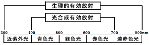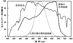 地球上のほとんどの植物は,太陽からの自然光を選択吸収しながら成育している。図1には,植物の成育に必要な波長範囲として400~700nmの光合成有効放射,300~800nmまでの生理的有効放射を示す。図2には,自然昼光と人間の眼の視感度曲線,植物の光合成の平均作用曲線を示している。自然昼光は,400~500nmの青色光にピークがあり,人間の眼では,500~600nmの範囲でピークは555nm近辺に存在する。一方植物では,光合成の基本的波長範囲は,400~700nmとされ,赤色光は,675nmのピークと625nmに小さなピークがあり,青色光は,440~450nmにピークがある。