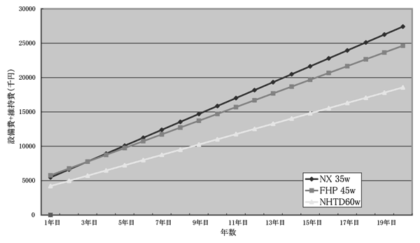 基本照明における経済性について,従来トンネル照明器具2種類(KPL035C,KPFHP0451C)と広スパン対応型トンネル照明器具を採用した場合の比較検討を行った。検討は,20年間ライフサイクルコストを算出し,その結果を表3に,20年間ライフサイクルコストの推移を図8に示す。比較検討の結果,広スパン対応型トンネル照明器具が最も経済的であり,既設の仕様であるKPL035Cと比較すると初期設備費20%削減,20年間照明費で32%削減が図れる。