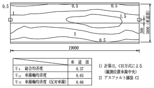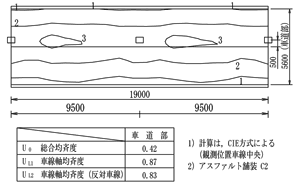 基本照明昼夜間時(S=9.5m)の総合均斉度は0.42,深夜時(S=19.0m)の総合均斉度は0.37であり,深夜時においても良好な輝度均斉度を確保している。