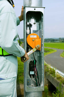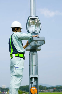 従って,作業者が一人でしかも歩道内で,下降操作とメンテナンスを行うことが可能となり,車線規制の必要がなく安全にそして,安心して作業に従事できることになる。車線規制の必要がないので渋滞や騒音を軽減でき,CO₂削減にも寄与することとなり,環境にも配慮され,国の施策である「安心・安全・環境」に対応した照明灯である。