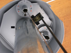可動部を収納するための防雨仕様の円筒形カバー内には,無接点機能のため安定器からランプまでの配線ケーブルを受け,昇降させる滑車が中央部に固定されている。天井面には,安全のためのロック機能が2組装着され,常時は可動部がロック状態にあり,メンテナンスの昇降時には,ウインチ操作によってロック状態を解除できる。