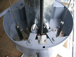 円筒形の可動部には,照明器具を取り付けるアームを外面に設け,その対面に回転昇降のためのガイドレールに対応したSUS製滑車が1組固定されている。昇降を円滑に安定して行うための補助滑車(ポール接触面は樹脂製)が,ポールを取り巻く4ヶ所で固定している。また,固定部のロック装置に対応した2組の装置でSUS製ポール内ワイヤーを固定している。