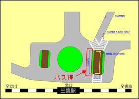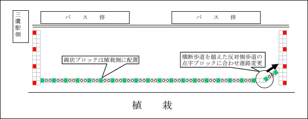 武蔵野市は東京都のほぼ中央,特別区の西部に接し,都心(新宿)から約12kmの地点に位置し,JR中央線の新宿駅から12分の三鷹駅北口駅前の交通島歩道に全長約19mに渡りLED付点字ブロックを設置した。(図1)