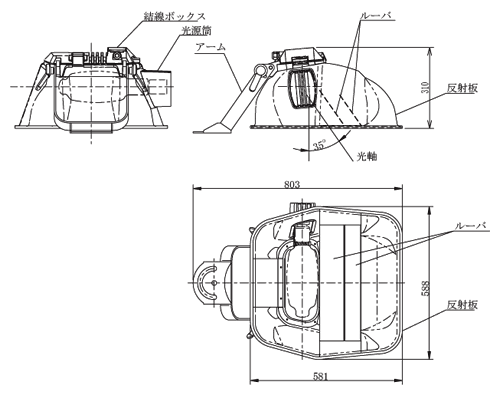 照明器具は,鉛直角0°の状態で光軸が35°前進し,ルーバが内蔵されている光害対策形投光器(図7)を採用しているため,従来の丸型投光器(ルーバ付)に比べ,プレーヤーへのグレアを軽減し,周辺及び上空への漏れ光を軽減させることができる。(図8,図9)