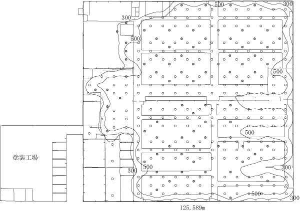 プロフォルム®400Wの採用にあたり,現状の照明(MF1000W×250台)と同照度(500ℓx)を得るために必要な台数は,約330台となった。照明器具配置は既設照明位置の249箇所とその他の増設(81台)により行った。図4に維持水平面照度分布図,工場内点灯状況を図5,6に示す。