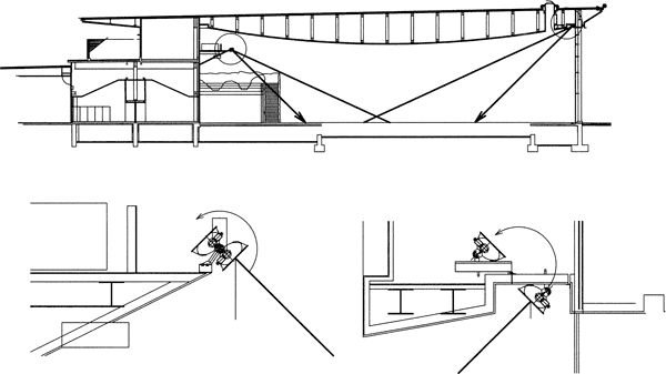 施設形状が円形のため照明器具の配置は,周囲の壁面上部の全周配置である。ランプ交換における維持管理対策として,高所取付であるが,足場等の設置が不要で背面作業が行える方法として,建築にて器具取付部を回転出来る構造を採用した(図4)。 - 照明設備