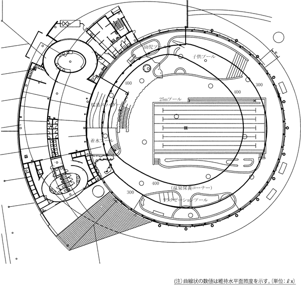 温泉施設を併設している屋内温水プールであるため,器具は前面ガラスのテフロン膜付,安定器は周囲温度-10℃~+50℃仕様とし,ランプは高演色・高効率・長寿命の特性を持つ,セラミックメタルハライドランプ400Wを採用した。照度レベルはレクレーションレベルとし,昼間時は太陽光の入射の補光照明として,壁側の灯具を点灯している。