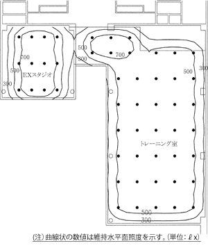 図7 EX スタジオとトレーニング室の配置図および照度分布図