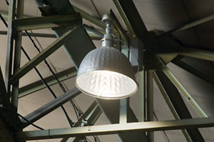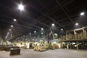 同工場の既設照明で使用していた水銀ランプ,高圧ナトリウムランプ,メタルハライドランプを,効率の良いFECセラルクスエース™に変更することによりCO₂削減を図った。また,専用高効率セード(SAW414,SAW214)と組み合わせる事で,より一層の省エネ効果を得ている(図4,図5)。器具の取付状況を図6に示す。